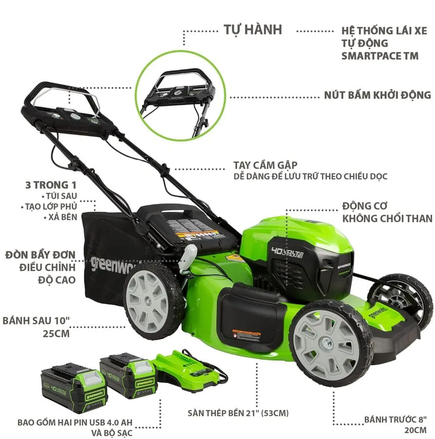 MÁY CẮT CỎ TỰ HÀNH – Làm được nhiều việc hơn, nhanh hơn với máy cắt cỏ chạy điện Greenworks. Máy cắt cỏ tự hành 40V này cung cấp thời gian chạy tới 70 phút với (2) pin 4.0Ah được sạc đầy (thay đổi tùy theo tình trạng cỏ và kỹ thuật của người vận hành). Bánh trước: 8 inch. Bánh sau: Bánh sau: 10 inch